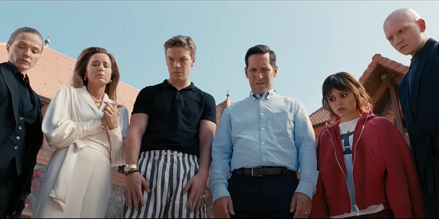 Emotionally estranged from her corporate lawyer father Elliot (Paul Rudd) following her mother’s death, college student Ridley (Jenna Ortega) is reluctantly accompanying him to the isolated Canadian Rockies wildlife reserve estate of the Leopolds, a mega-rich pharmaceuticals family comprising entitled incompetent ex-junkie nepo son Shep (Will Poulter), obsequious materialistic wife Belinda (Téa Leoni) and billionaire patriarch Odell (Richard E Grant), who, terminally ill with cancer and not having faith in his son’s acumen,, is looking to bring Elliot on board to act as legal liaison after his death . Ridley is naturally cynical about their professed altruism (“Philanthropy is just reputation laundering for the oligarchy”) and, indeed she’s quickly proven right.