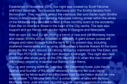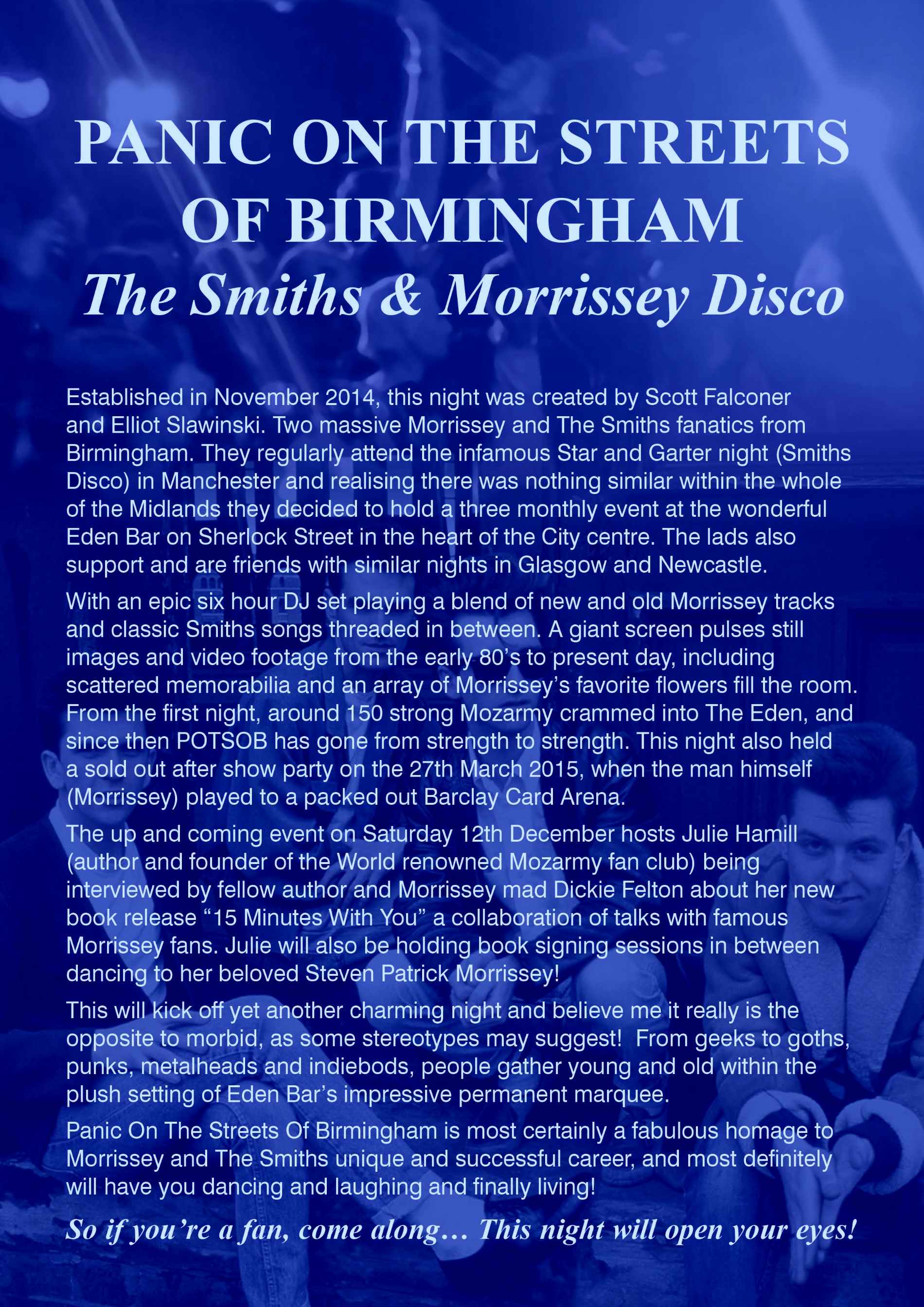 Established in November 2014, this night was created by Scott Falconer and Elliot Slawinski. Two massive Morrissey and The Smiths fanatics from Birmingham. They regularly attend the infamous Star and Garter night (Smiths Disco) in Manchester and realising there was nothing similar within the whole of the Midlands they decided to hold a three monthly event at the wonderful Eden Bar on Sherlock Street in the heart of the City centre. The lads also support and are friends with similar nights in Glasgow and Newcastle.
