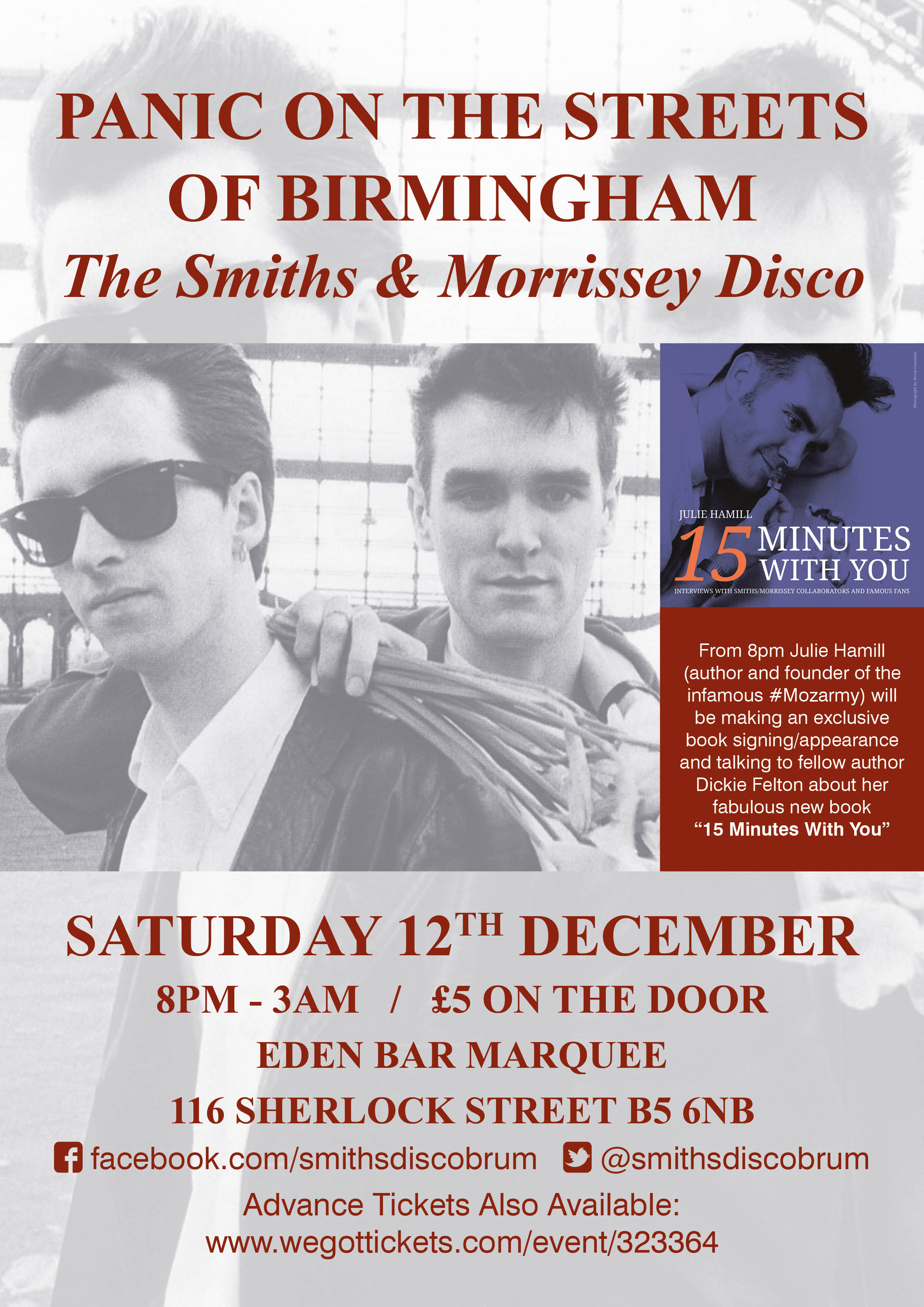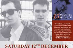 The up and coming event on Saturday 12th December hosts Julie Hamill (author and founder of the World renowned Mozarmy fan club) being interviewed by fellow author and Morrissey mad Dickie Felton about her new book release “15 Minutes With You” a collaboration of talks with famous Morrissey fans. Julie will also be holding book signing sessions in between dancing to her beloved Steven Patrick Morrissey!