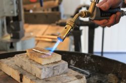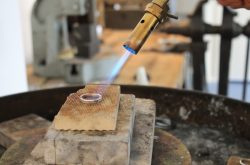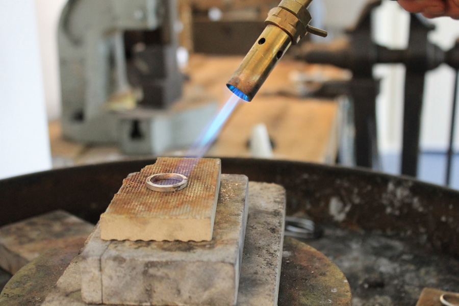 The next step is to solder the gap in the ring, which is fiddly. Using tiny pieces of silver solder and heating until it melts into the gap. It is so much fun and satisfying to see. We now have what resembles a ring, all be it a bit rough round the edges. The next step is to hammer it out again to get a perfect circle as the silver stays soft and is still malleable.