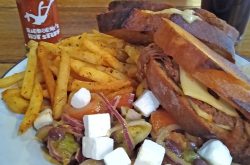 If salad isn’t your thing, there are plenty of other treats to choose from. My partner in crime is a carb man, so he indulged in the beef brisket Cubano. To hunky slices of sour dough filled to the max with melt in the mouth brisket, spiced nduja sausage and melted cheese. Served with fries and a feta salad garnish. A gent with a healthy appetite, even he was beaten. Clearly it was the salad that got left behind. I indulged in a nibble- reviewers rights, and it was a dreamy sandwich. Rich with butter and filling.