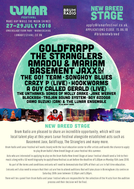 Music students from across the Midlands are being offered the chance to join the 2018 Lunar Festival line-up alongside headliners Amadou & Mariam, Basement Jaxx, Goldfrapp and The Stranglers thanks to a new initiative led by Brum Radio.