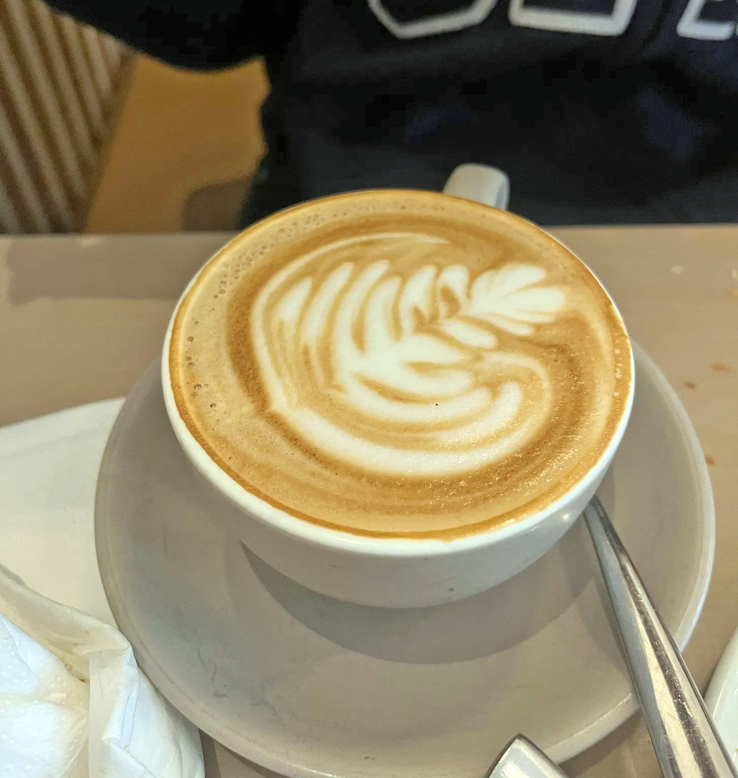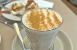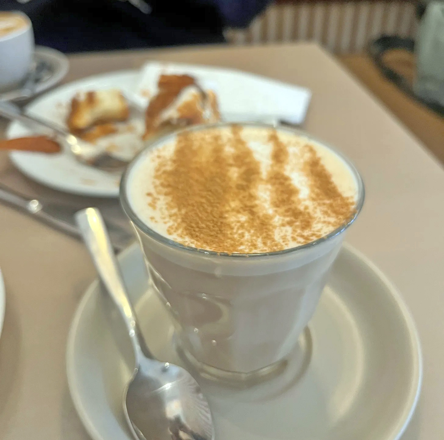 The chai latte arrived in a water glass something which I’ve condemned in the past however, the size was acceptable so I won’t kick up a fuss this time. It came piping hot and dusted in cinnamon for that extra layer of warmth. The flavour was good – the right kick of spices, almost as sweet as my date, but just enough to let the flavours shine through. Each sip felt like a warm hug.