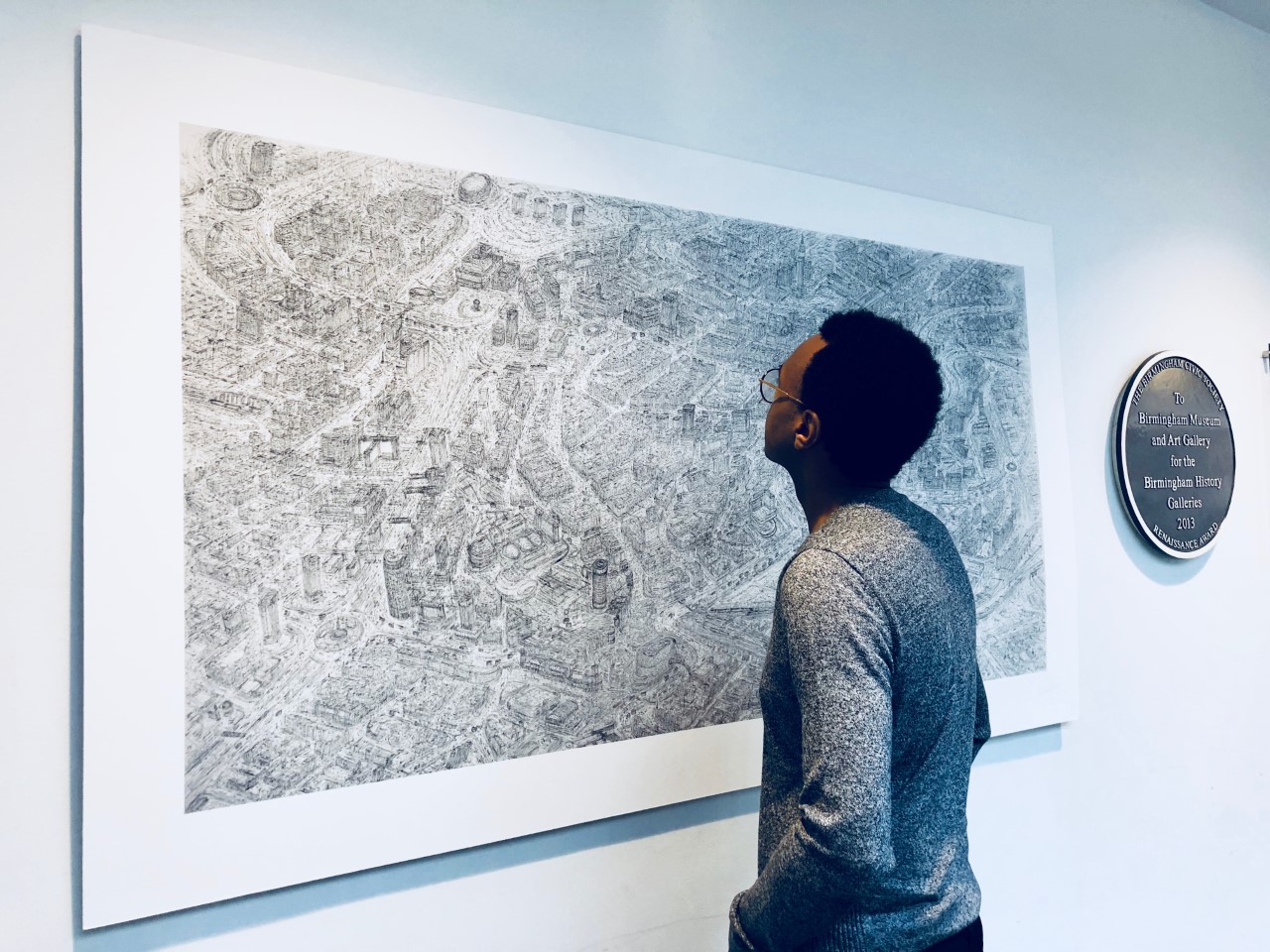 The sketch of Birmingham was completed in October 2016 and went on show at the Birmingham Museum and Art Gallery.