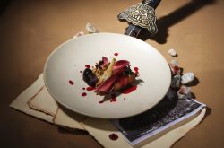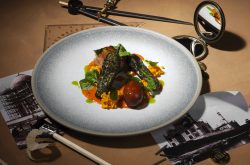 The menu unfolds as a culinary journey across continents, beginning in Greece and Italy. The first course, Statue of Zeus at Olympia, evokes bold Mediterranean flavours with a black olive beignet, smoked beef, and ashed curds. This is followed by The Colosseum, a Roman-inspired dish of smoked pork belly, globe artichoke, fregola sarda, black garlic, and bitter chicory.