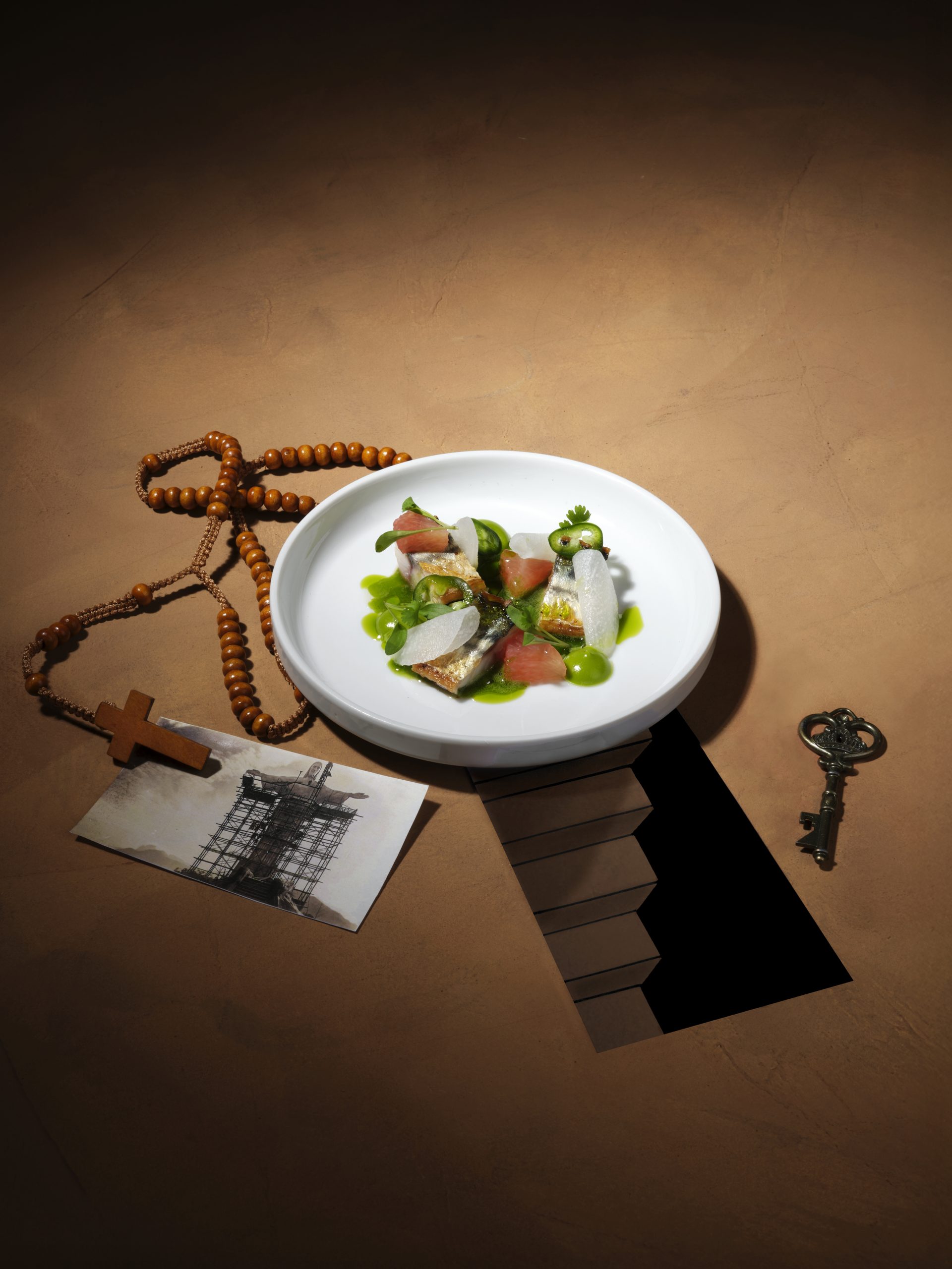 From Europe, the journey heads across oceans. The third and fourth courses traverse new worlds—from the vibrant streets of Brazil to the ancient walls of China. Christ the Redeemer brings together scorched mackerel, zesty leche de tigre, grapefruit, and crisp turnips, offering a bright, refreshing contrast.