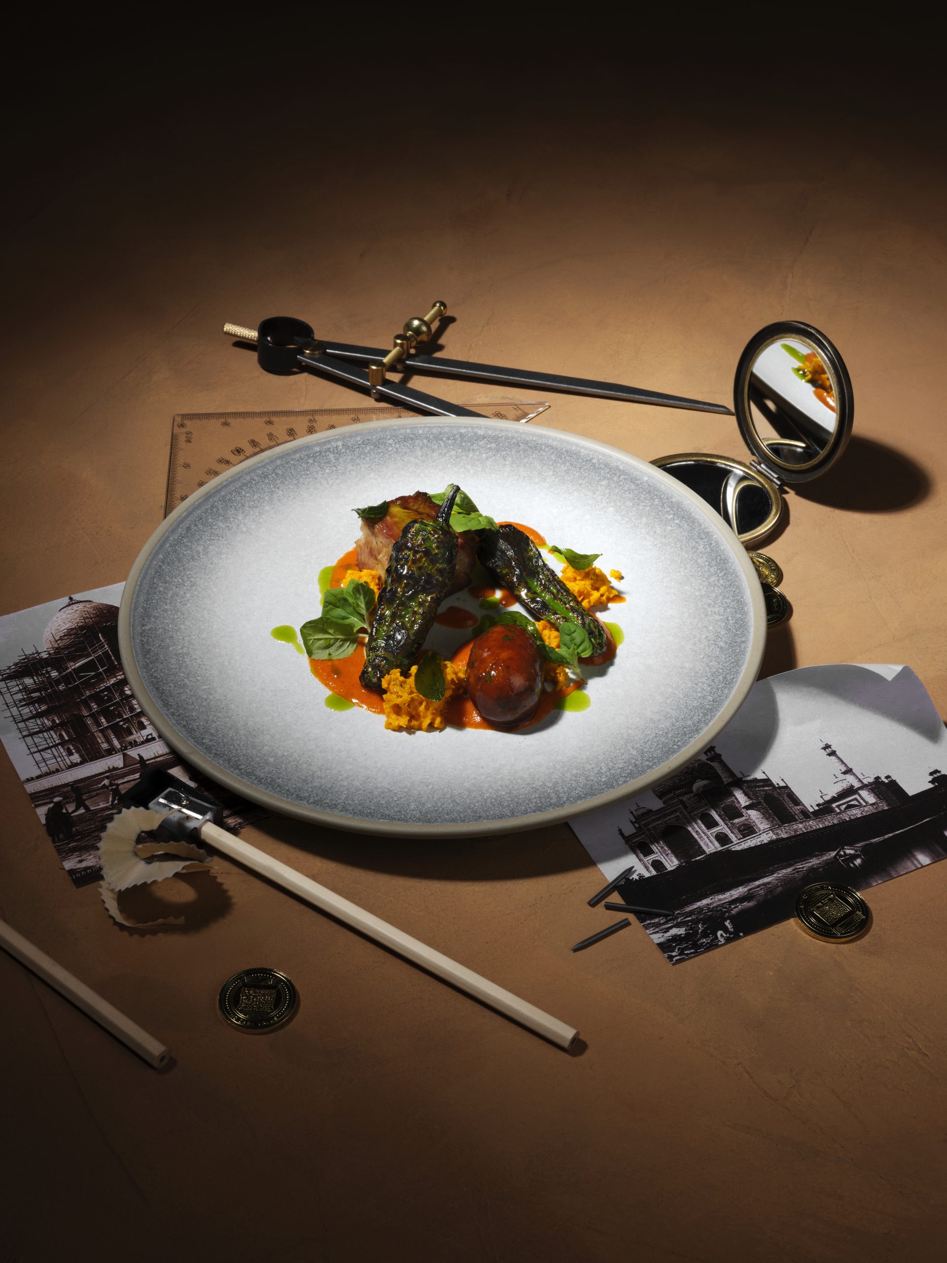 kimchi, Asian cucumber, XO sauce, and a delicate lemongrass and ginger foam. The fifth course returns to the Indian subcontinent with the Taj Mahal—a decadent lamb makhani paired with masala chouriços, burnt pepper, and a punchy curry leaf and coconut pickle.