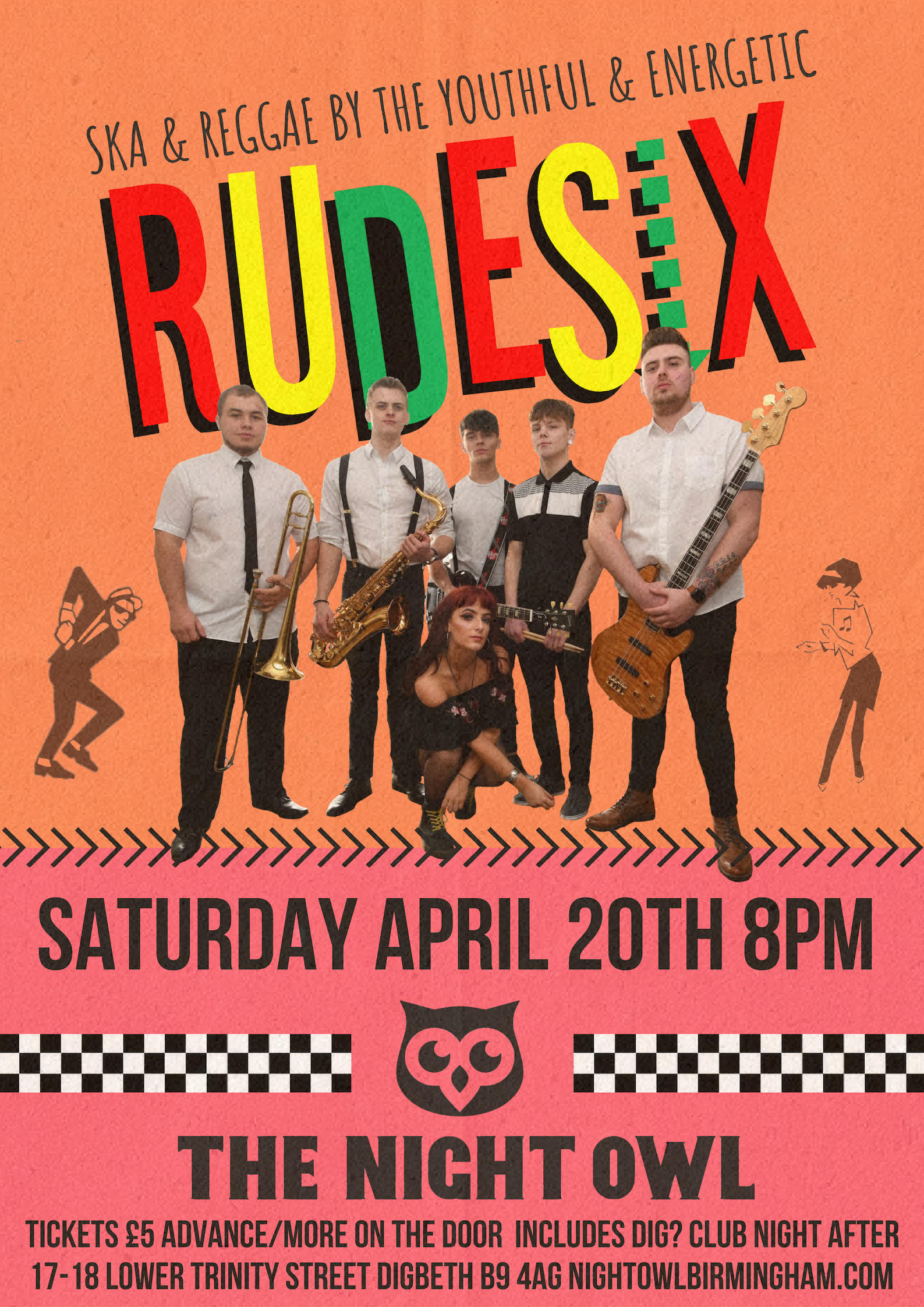 Inject some ska into your Saturday on April 20th as brand new band Rude Six head to The Night Owl. This young, energetic ska and reggae outfit cover all the classics from Toots, The Specials and The Selecter as well as their own original tracks, catch them live followed by a ska-infused Dig? club night with DJs Steve Davis from The Ska 45’s and Mazzy Snape.