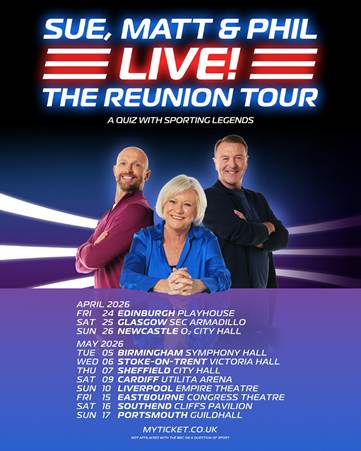 Special guests have been added to Sue, Matt & Phil Live! The Reunion Tour – the show which sees Sue Barker, Matt Dawson, and Phil Tufnell reunite on stage, entertaining audiences and putting their sporting knowledge to the test all over again.