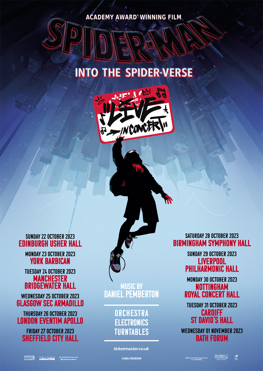 After an eagerly anticipated and glowing sold-out world premiere at the historic Kings Theatre in Brooklyn, New York in March, Spider-Man: Into the Spider-Verse Live in Concert will head to venues across UK cities, calling at Edinburgh, York, Manchester, Glasgow, London’s Eventim Apollo, Sheffield, Birmingham, Liverpool, Nottingham Cardiff and Bath.