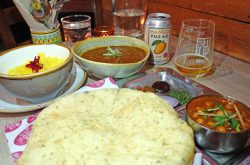 The bread is soft fluffy, and fried (a lush alternative to a naan), which is served with marinated curried chickpeas and complimentary condiments – home-made lime pickle, fresh mint chutney, tamarind, red onions & green chilli. Dipping the bread into the curry is a must!