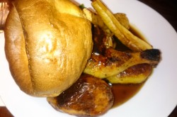 Every good roast has peas and parsnips etc, vegetables are important for nutrition, yeah sure, but if cooked right can set the scene for the main event, erm, well.. There were actually two main events here, the chicken and the Yorkshire pudding. Anyway, the veg was cooked just right for me, roasted to perfection with a soft inner which didn’t lie heavily.