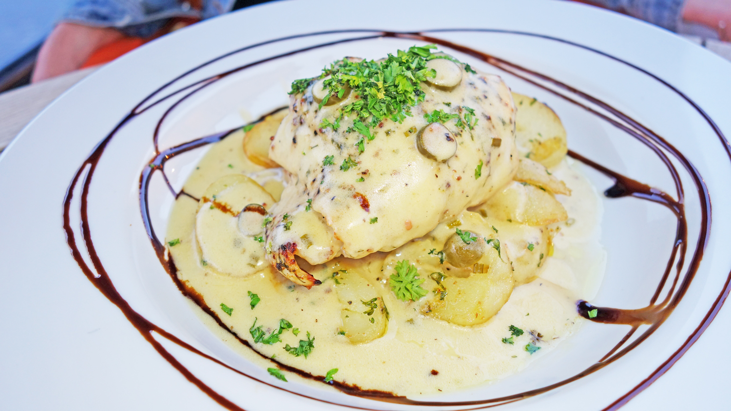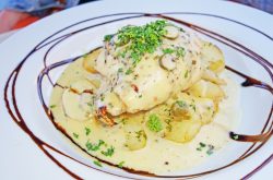 I asked the chef to recommend a main course to compliment my starter, and he sent out a dish from the a la carte menu: baked cod in a white wine and caperberry sauce topped with sauté herb garlic new potatoes, accompanied with house salad. This next chapter in my seafood journey was out of this world; the baked cod, steaming hot, fell apart when touched, and the sliced new potatoes in their creamed garlic sauce were the perfect follow-on from the previous course. I accompanied this with an Italian Pinot Grigio that was light and refreshing.