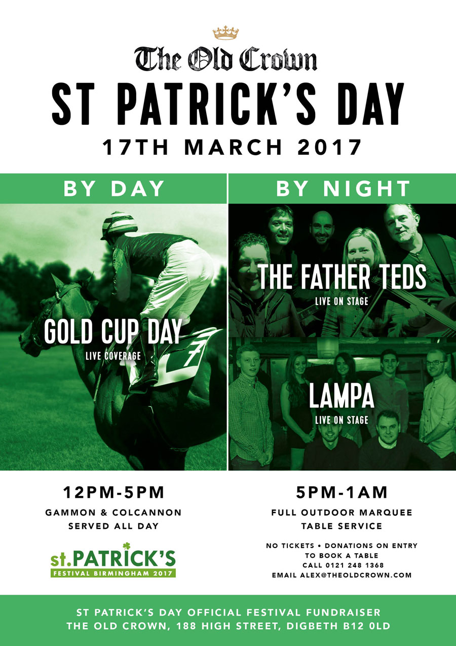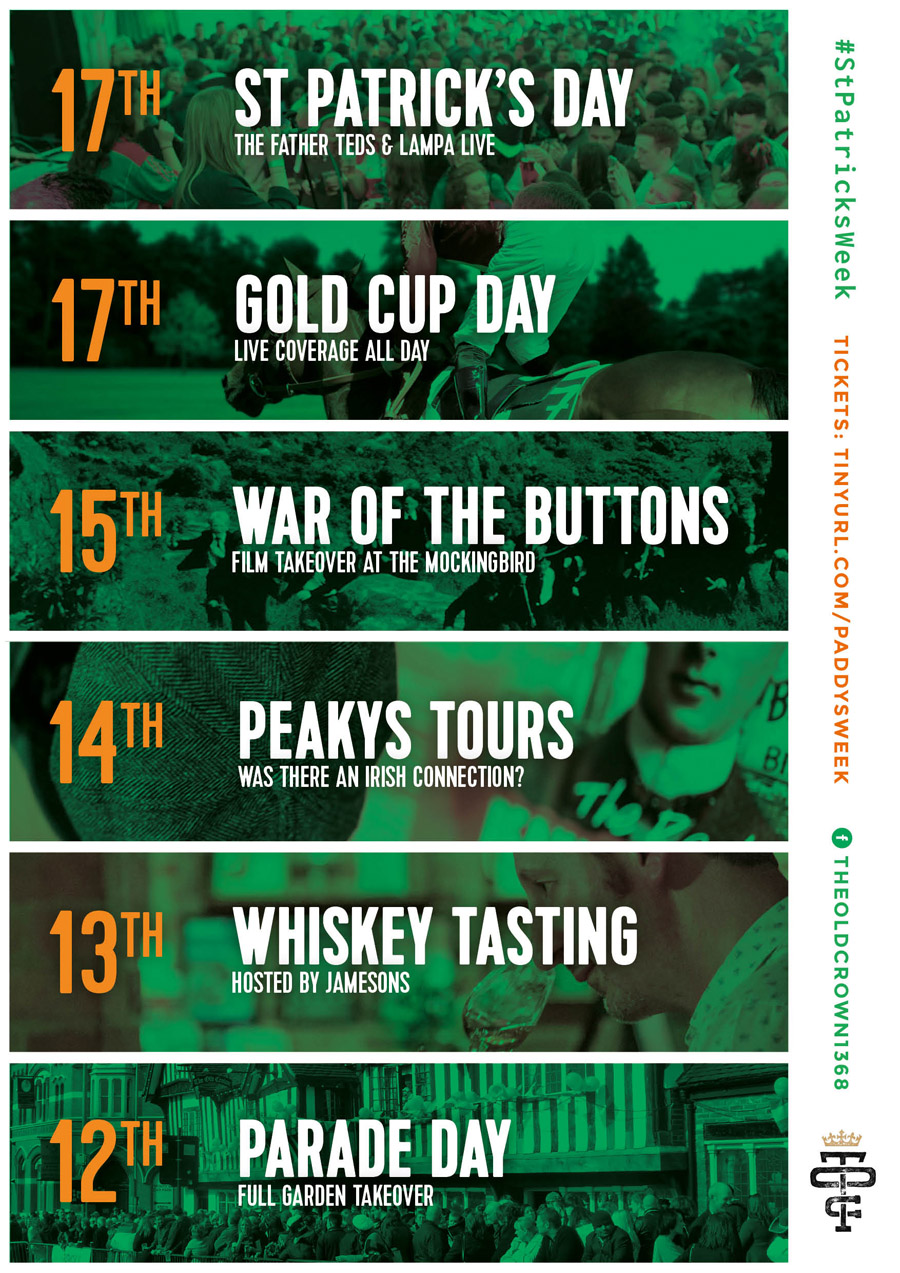 Birmingham’s oldest inn, The Old Crown in Digbeth High Street, (theoldcrown.com) is celebrating St Patrick’s Day with a week long program of events celebrating the best in Irish culture. Showcasing food, drink, films, sport, music and more there will be something for everybody to enjoy. Full information can be found at www.tinyurl.com/oldcrownparade