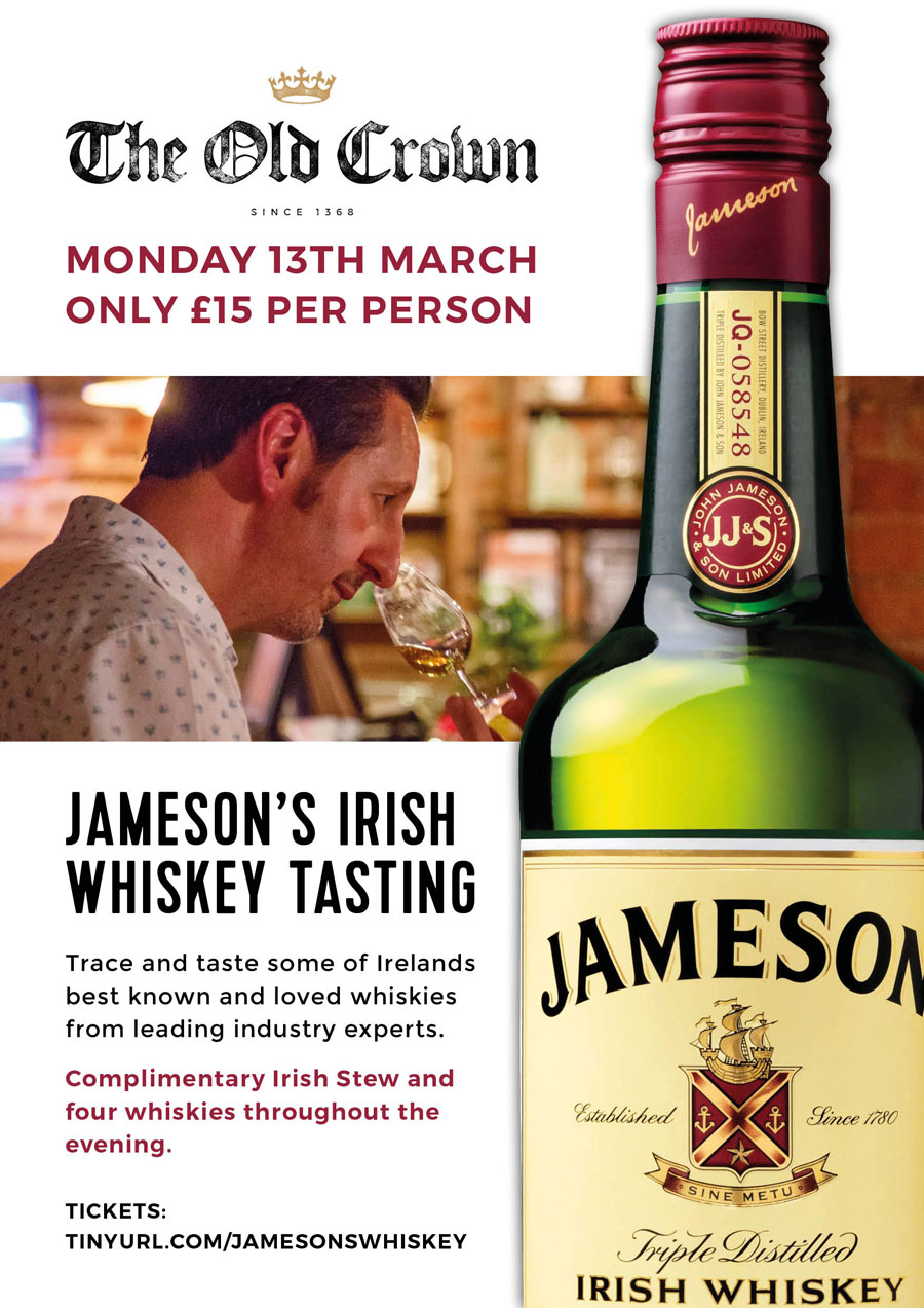 On Monday 13th March the pub have teamed up with Jamesons for a night of Irish whiskey tasting. Explore four of Ireland’s best known and loved whiskies with industry experts on hand to answer any questions you may have.
