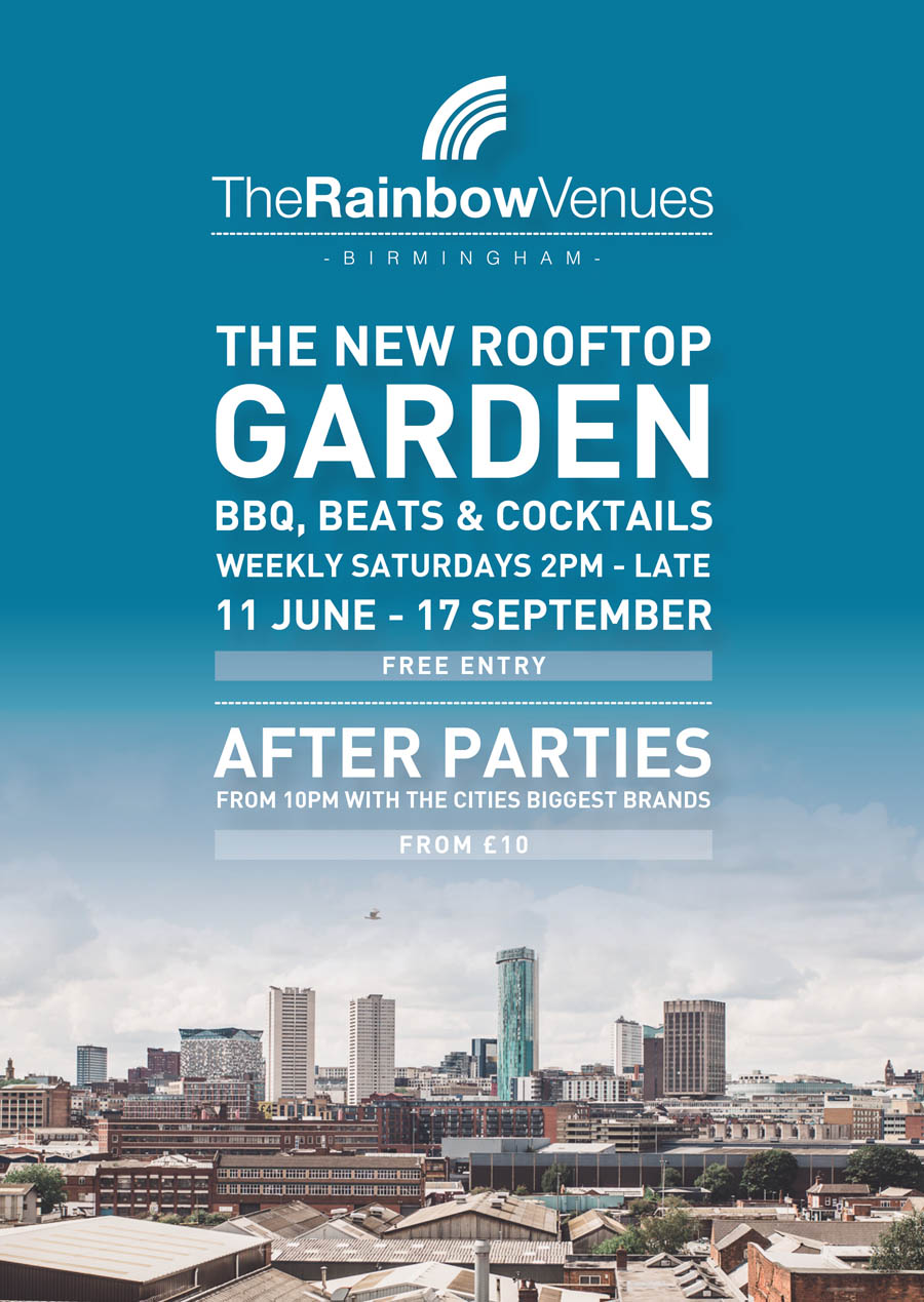 The Rainbow Venues 16-weeks of summer parties kicks off on Saturday, June 11th with live European football from 14:00 and the rooftop garden party with DJ HAUS (Rinse FM) headlining from 22:00.