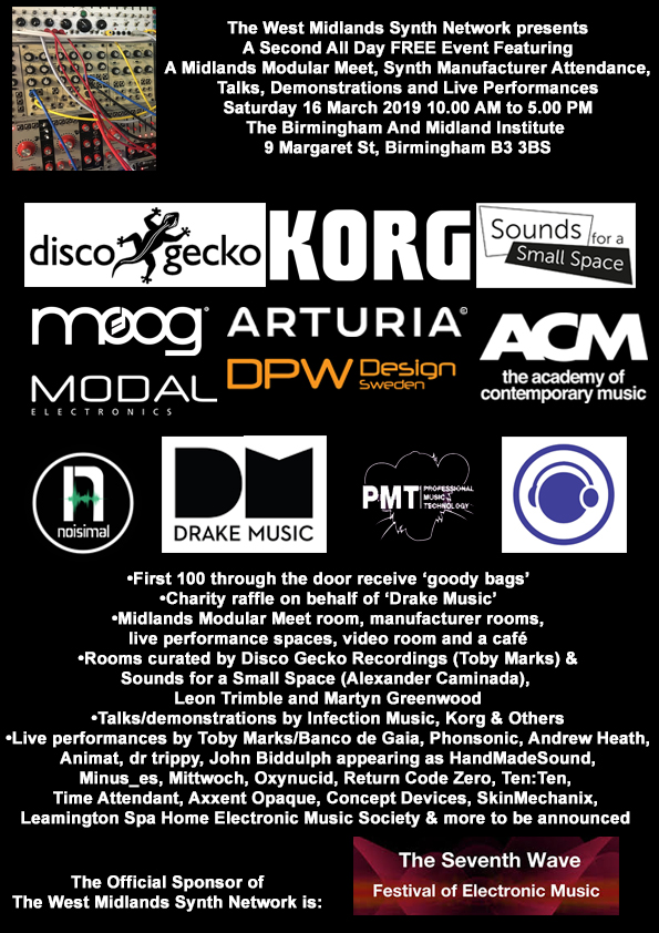 The West Midlands Synth Network presents A Second All Day FREE Event Featuring a Midlands Modular Meet, Synth Manufacturer Attendance, Talks, Demonstrations and Live Performances