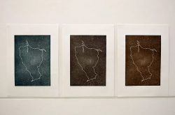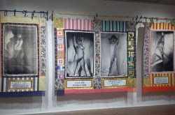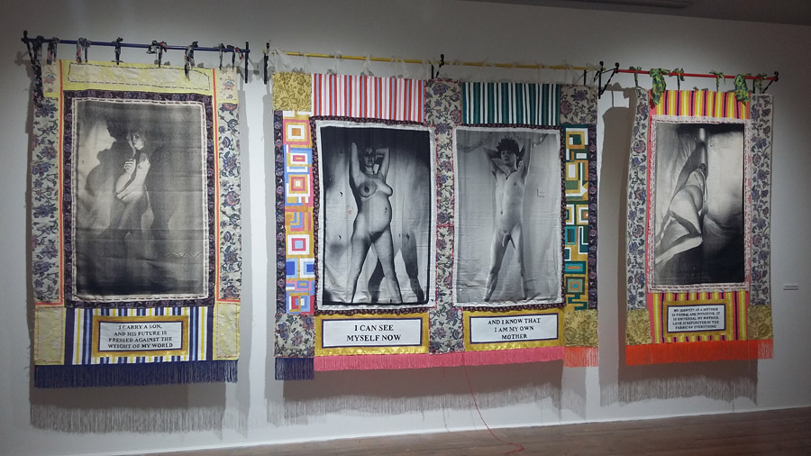 I was immediately drawn to Stokes’ print and textile wall hanging entitled ‘I Saw My Mother Naked And…’ which showed this skilled mixed media artist reinventing the traditional genre of portraiture to consider identity. Stokes incorporates the use of found domestic materials, silkscreen printing, painting and drawing to create large textile works that explore the relationships that exist between himself and his family, and refers to them as ‘visual poems’. In this work, he has used poignant family photos of his mother, when she was pregnant with him, standing strong and gazing out at the viewer.