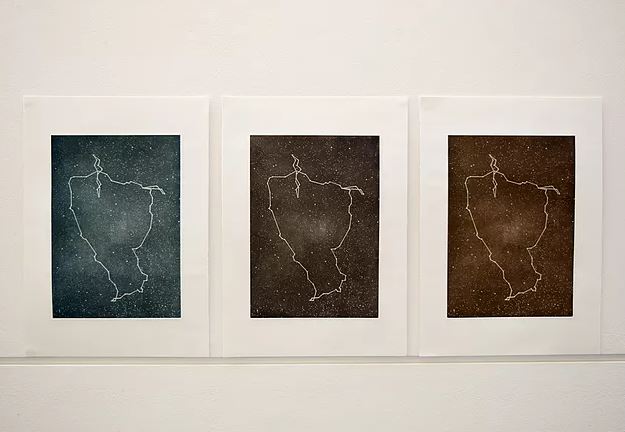 On show by Suzie Hunt are 16 black and white photographs of the places she passes by on her train journey to Birmingham. They are places in between, symbolising the unfamiliar spaces outside of our own familiar places in the world, and the borders we each construct. Passing beyond a black curtain into a darkened room, I find the work ‘Constellations’. 16 stunning photo etchings on light boxes show GPS data, as well as memory maps, of the places she has visited, echoing constellations in the night’s sky. These surround a large, dangling globe onto which she has projected the data and imagery from her journeys into space. There is something so fragile and delicate about her powerful projections and hidden worlds.