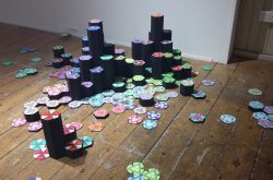 The moving installation work of Douglas explores displacement, refugees, and homelessness, which is noticeably on the rise in Birmingham. She points out to me that ‘this could happen to anyone’, which she wants to make clear in her practice. A tall structure of rags, above a used mattress, holds a rucksack, intimating at transitory human presence and isolation. It is rather haunting, and sadly true to life, as many of pass by, and try to hide from view, the homeless people huddled against shop doors in Birmingham city centre.