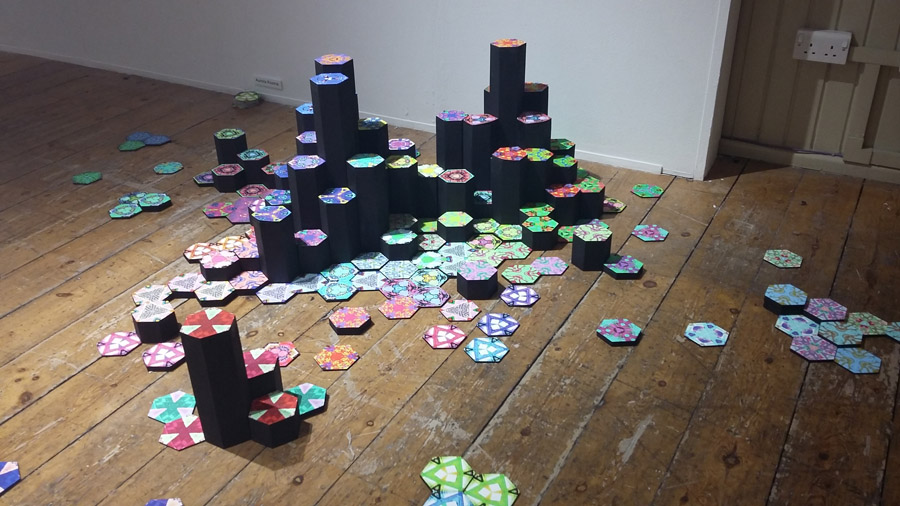 Kozma’s work directly deals with the development of Birmingham, which she has witnessed over the last three years. ‘Metropolis (Mother City)’ mimics the causeway and structures of a rising city, which is built up of different communities. Starting with photographs of traffic and engineering works, she Photoshops these, drawing out the repetition of shapes to reflect on the infinite. She also intensifies the colours to create strikingly patterned tiles and mosaic-like textiles. These are then transformed from 2D form to mesmerising 3D architectural structures.
