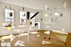 In Brogan Thomas’s digital collages, such as ‘Ambiguous Bedroom’, this artist wittily re-imagines middle-class spaces into abstract assemblages. The pop art of Richard Hamilton meets IKEA in these uncanny images. Experimenting with different depictions of modern interior spaces, from the living room to the bedroom, she contrasts geometric fields of abstraction and highly rendered recognisable details, to create an eerie play on painterly illusion. The push and pull between the two builds up levels of objects in illusionary space, which leaves the viewer filling in the gaps.
