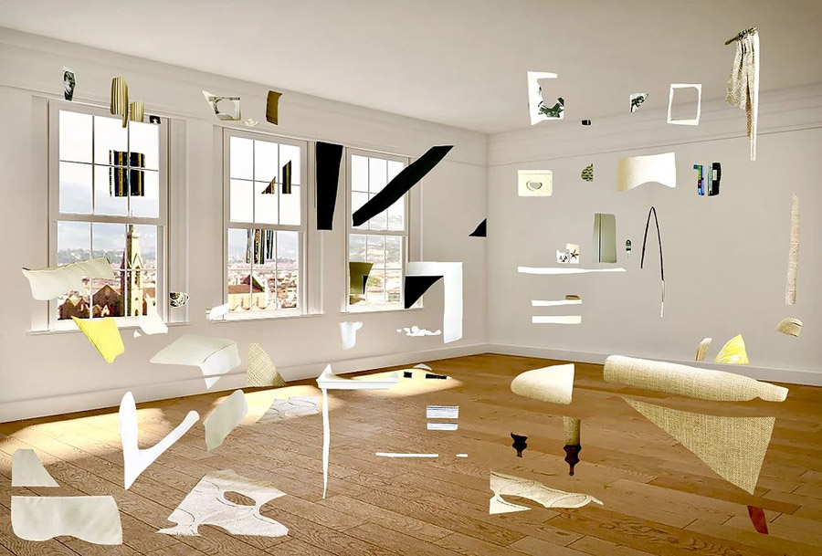 Interior Design is a prevalent subject in my work. I create collages of recognisable interiors which are infused with abstract elements. The shifting between representation and abstraction generates an environment which doesn’t seem real, yet also creates a vivid sense of place, playing on the illusion of what is flat and what is three-dimensional – Brogan Thomas.