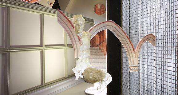 On show within the ornate entrance hall to Birmingham School of Art is Yeomans’ installation ‘Opus Locus’. Within a small room, which seems to belong to a mad magician, is a book on ‘Folklore Myths’, world maps atop a paint-marked desk, and a wine glass with remnants of red wine still present. The floor is covered in rich Moroccan Berber rugs, woven in red and post-it notes covered in scribblings, drawings and creative notations in black ink. At the same time, Yeomans breaks the illusion and fantasy with his satirical pot of gold: a glass jar is filled with bronze pennies and labelled ‘Student Finance England’.